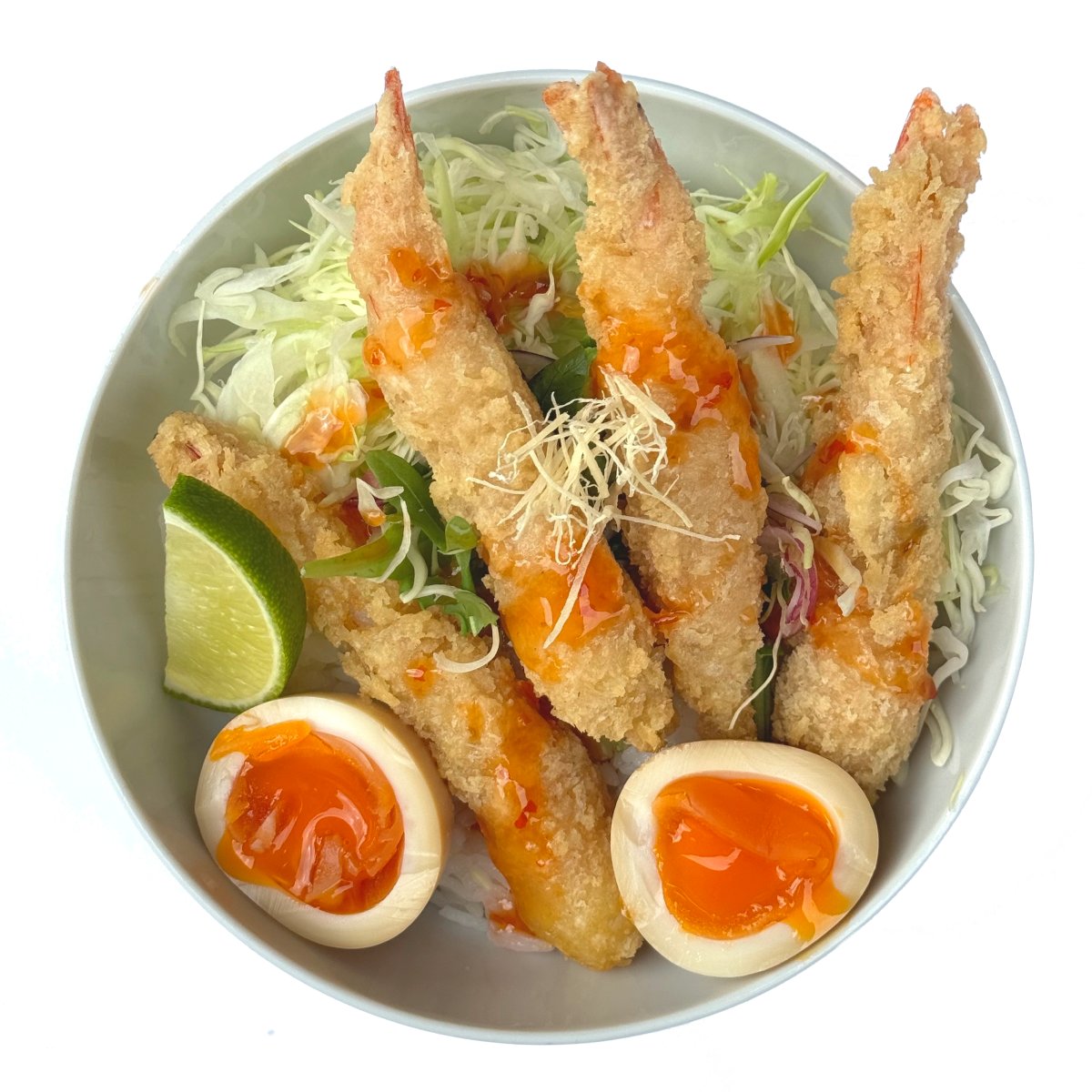 Camarão, ovo, cebola crocante, sweet chilli e repolho – (Opção Almoço: Por 1,00 €, inclua uma água, chá ou limonada. Por 1,50 €, inclua um refrigerante ou cerveja nacional.)