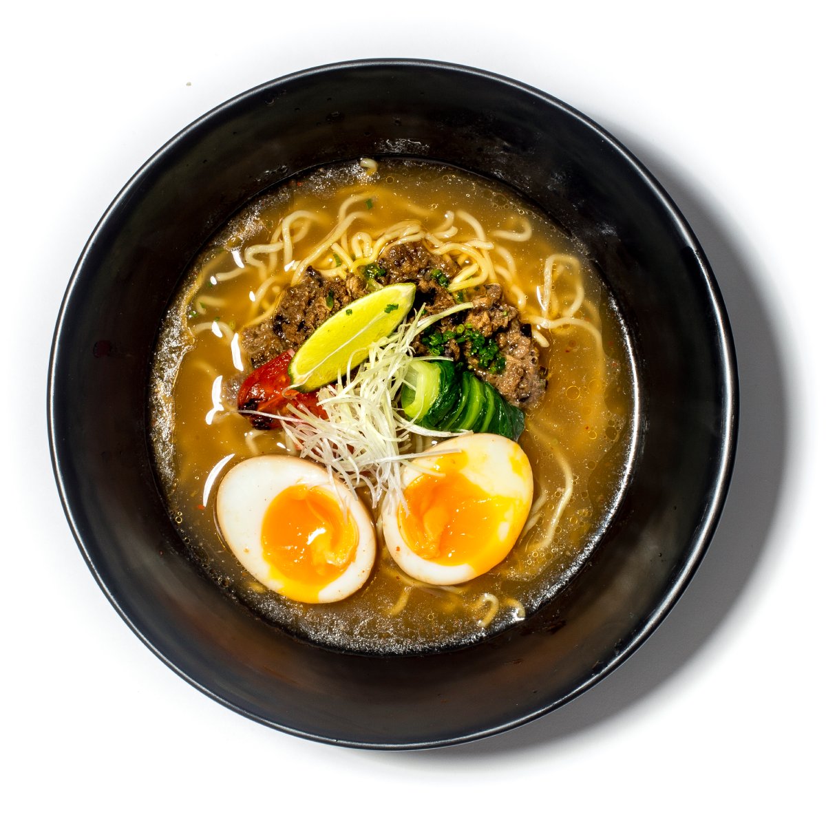 Caldo kimchi, carne picada, ovo, pak choi e lima – (Opção Almoço: Por 1,00 €, inclua uma água, chá ou limonada. Por 1,50 €, inclua um refrigerante ou cerveja nacional.)